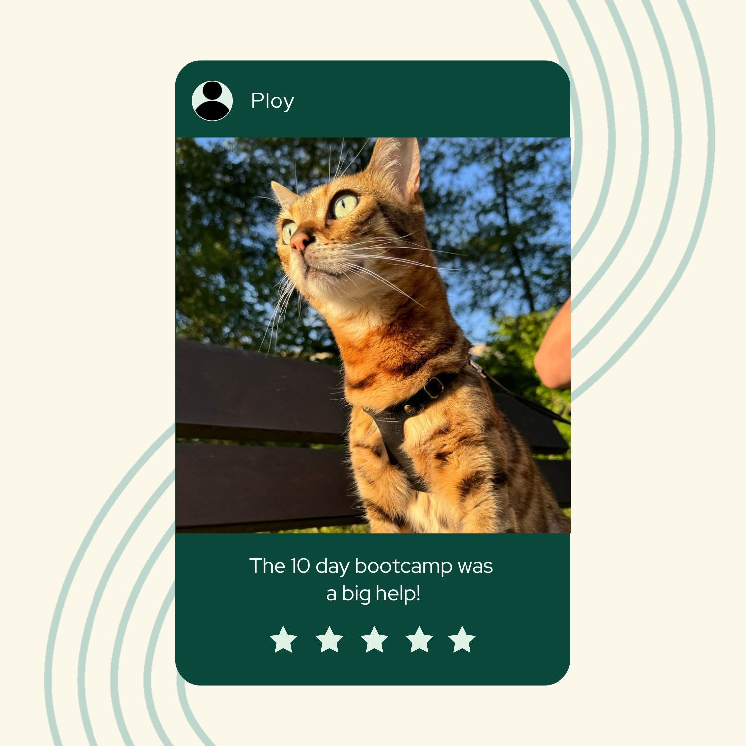 After 10 days, your cat will be confidently wearing and walking in their harness and ready to begin exploring the world with you. You’ll have a strong foundation, a happy training routine, and a cat who feels safe and secure every step of the way.