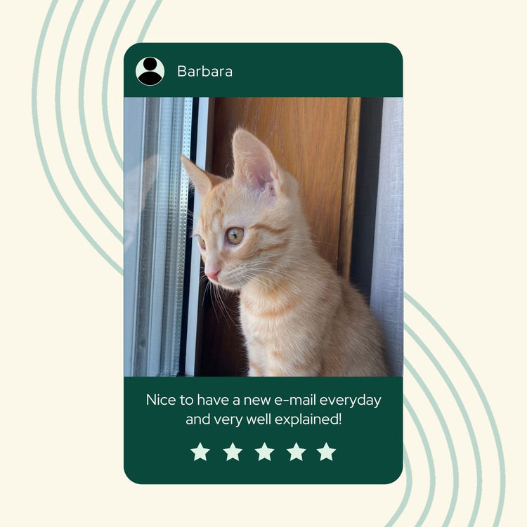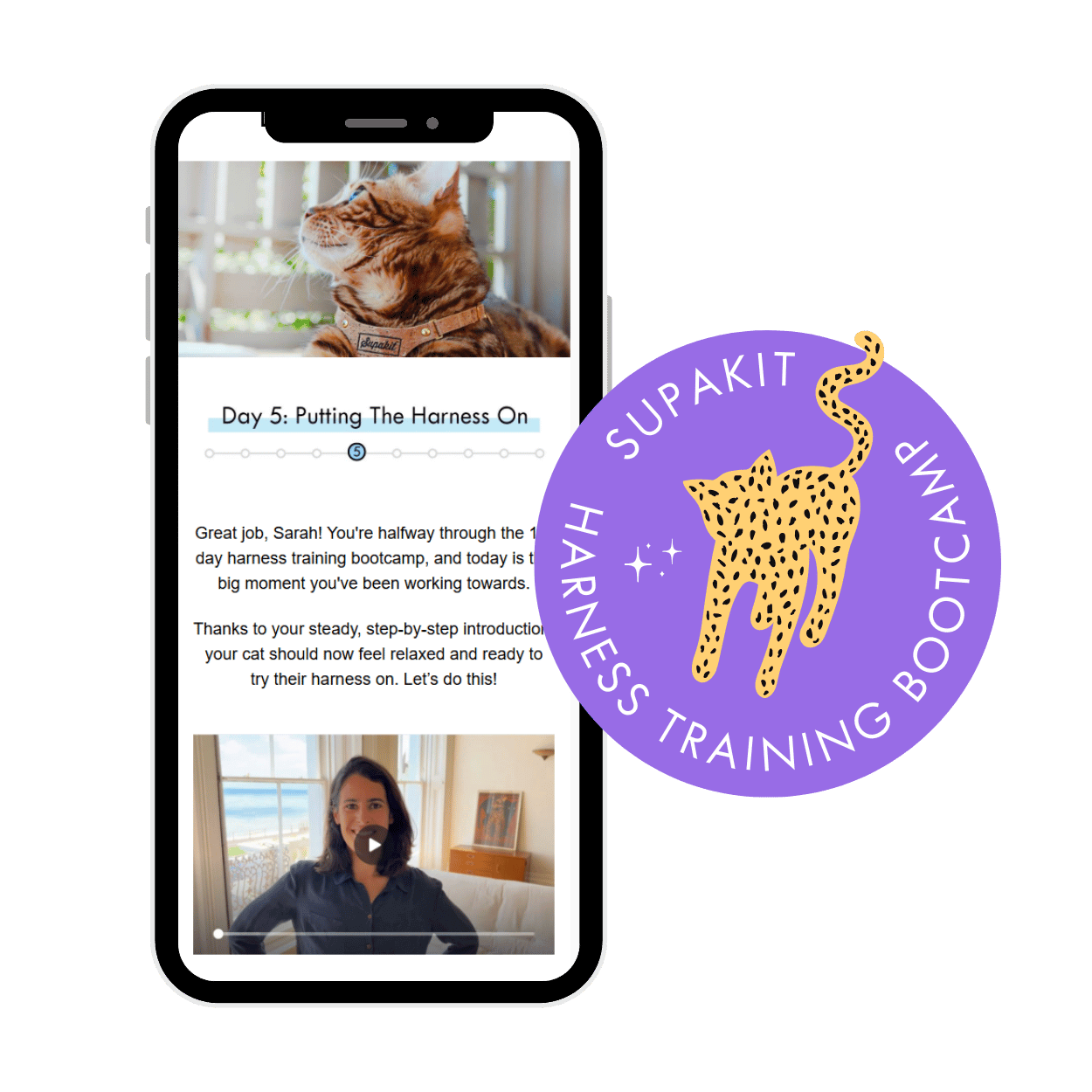 For the next 10 days, you'll receive a free, easy-to-follow training video straight to your inbox every day. Each bite-sized lesson features a fun exercise that's enriching for your cat and a bonding experience for you both, making harness training joyful and achievable in just five minutes a day.